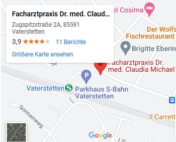 Unsere Praxis liegt direkt an der S-Bahnstation Vaterstetten und ist zu Fuß bestens erreichbar. Unsere Anmeldung befindet sich im 2. Stock, weitere Praxisräume im 1. Stock.